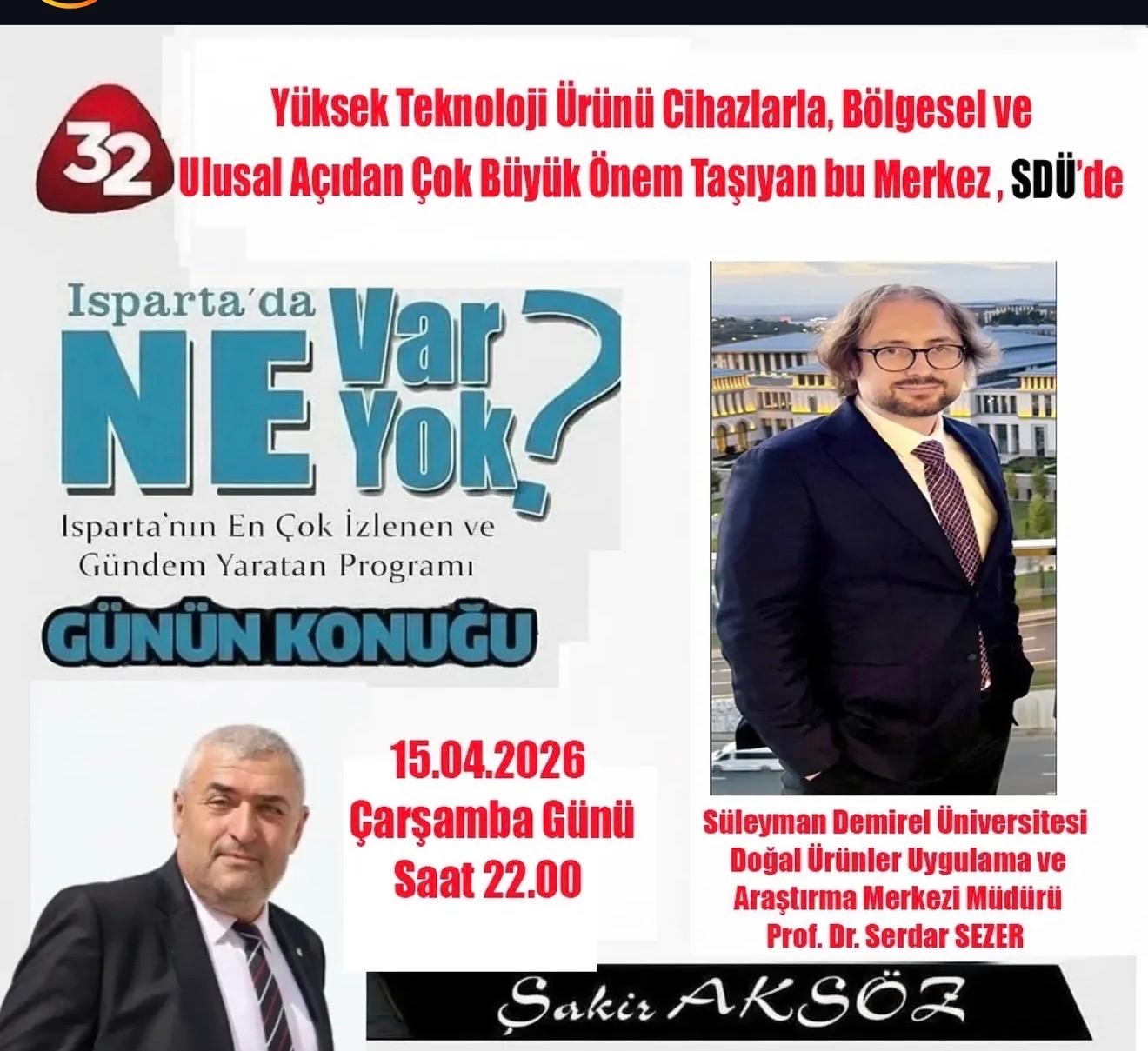 Süleyman Demirel Üniversitesi'nin yüksek teknoloji üssü olarak kabul edilen ve ileri düzey cihaz altyapısıyla hem bilim dünyasına hem de sanayiye önemli katkılar sunan SUDUM, şehrin ve bölgenin nabzını tutan ekranlara taşınıyor. Merkez Müdürümüz Prof. Dr. Serdar Sezer, Isparta’nın en çok izlenen ve gündem yaratan programı "Isparta’da Ne Var Ne Yok?" canlı yayınında Şakir Aksöz’ün sorularını yanıtlayacak.
